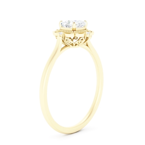 טבעת אירוסין בסגנון וינטג', משובצת יהלום במרכז בחיתוך קושן, בשיבוץ ארבע שיניים ומעוטרת יהלומים סביב.